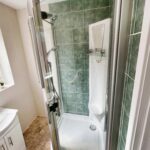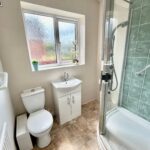 A modern three piece white suite comprising of a large walk-in shower unit, low level WC, wash hand basin with storage cupboard underneath, radiator, part tiled walls, ceiling point and UPVC double glazed side window.