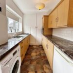 A range of wall and base units with complementary worksurface, one a half bowl sink unit with drainer, four ring gas hob, electric oven, plumbed for washing machine, Combi boiler, ceiling point, UPVC double glazed side window and a composite double glazed side door.