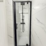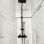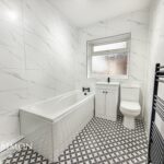 A newly fitted bathroom with a four piece suite in white comprising of low level WC with button flush, inset hand wash basin with mixer tap and under cabinet storage, panelled bath with mixer tap and walk in shower enclosure with integrated shower system. Tastefully finished with ceramic wall and floor tiling and heated towel rail and ceiling light point.