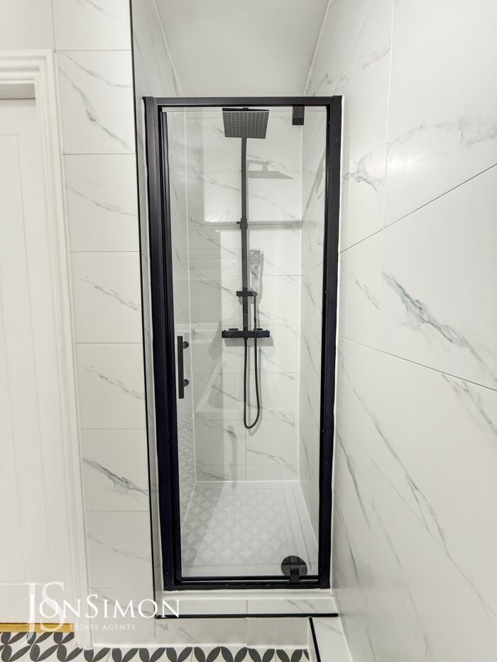 A newly fitted bathroom with a four piece suite in white comprising of low level WC with button flush, inset hand wash basin with mixer tap and under cabinet storage, panelled bath with mixer tap and walk in shower enclosure with integrated shower system. Tastefully finished with ceramic wall and floor tiling and heated towel rail and ceiling light point.