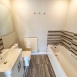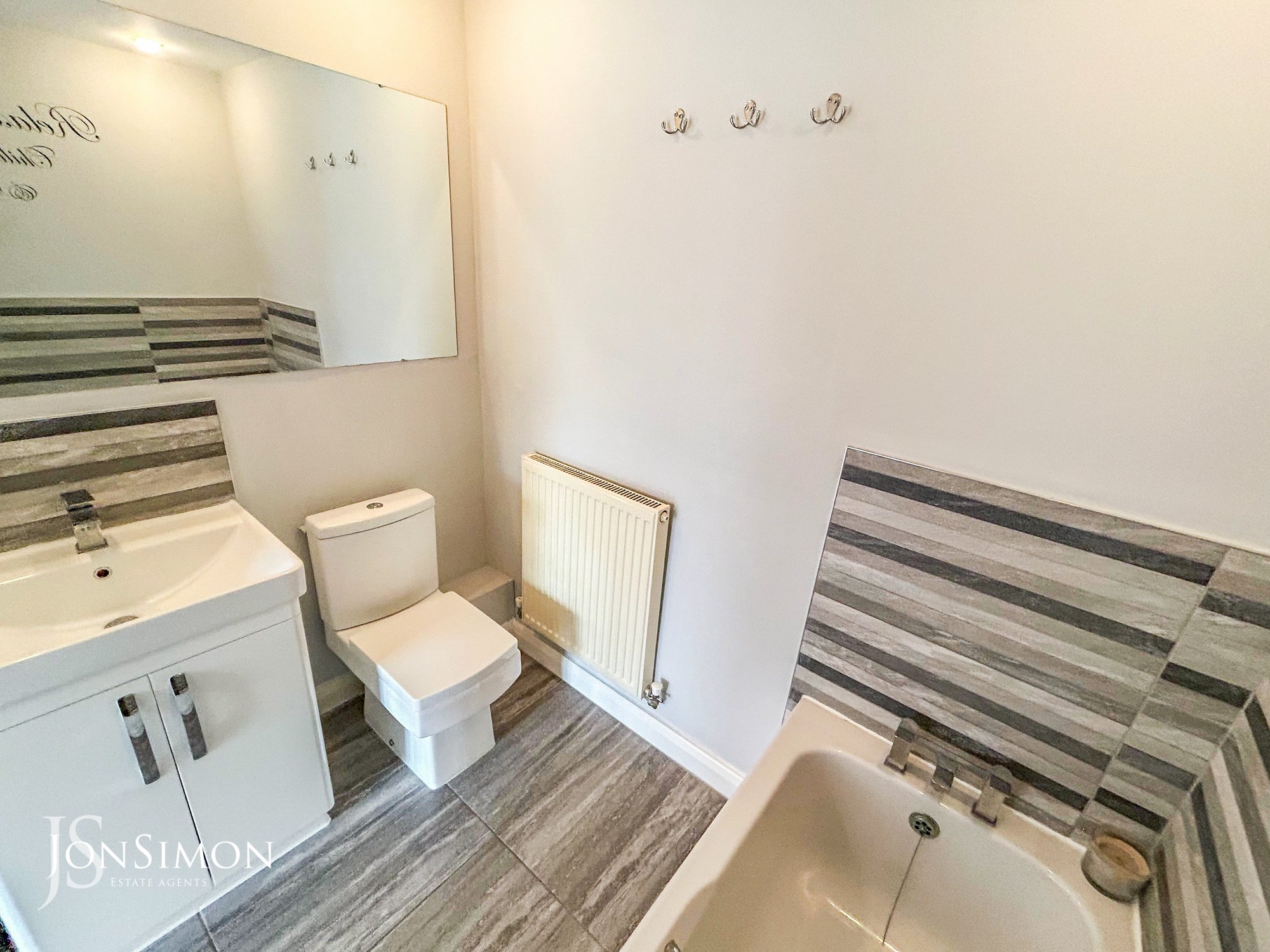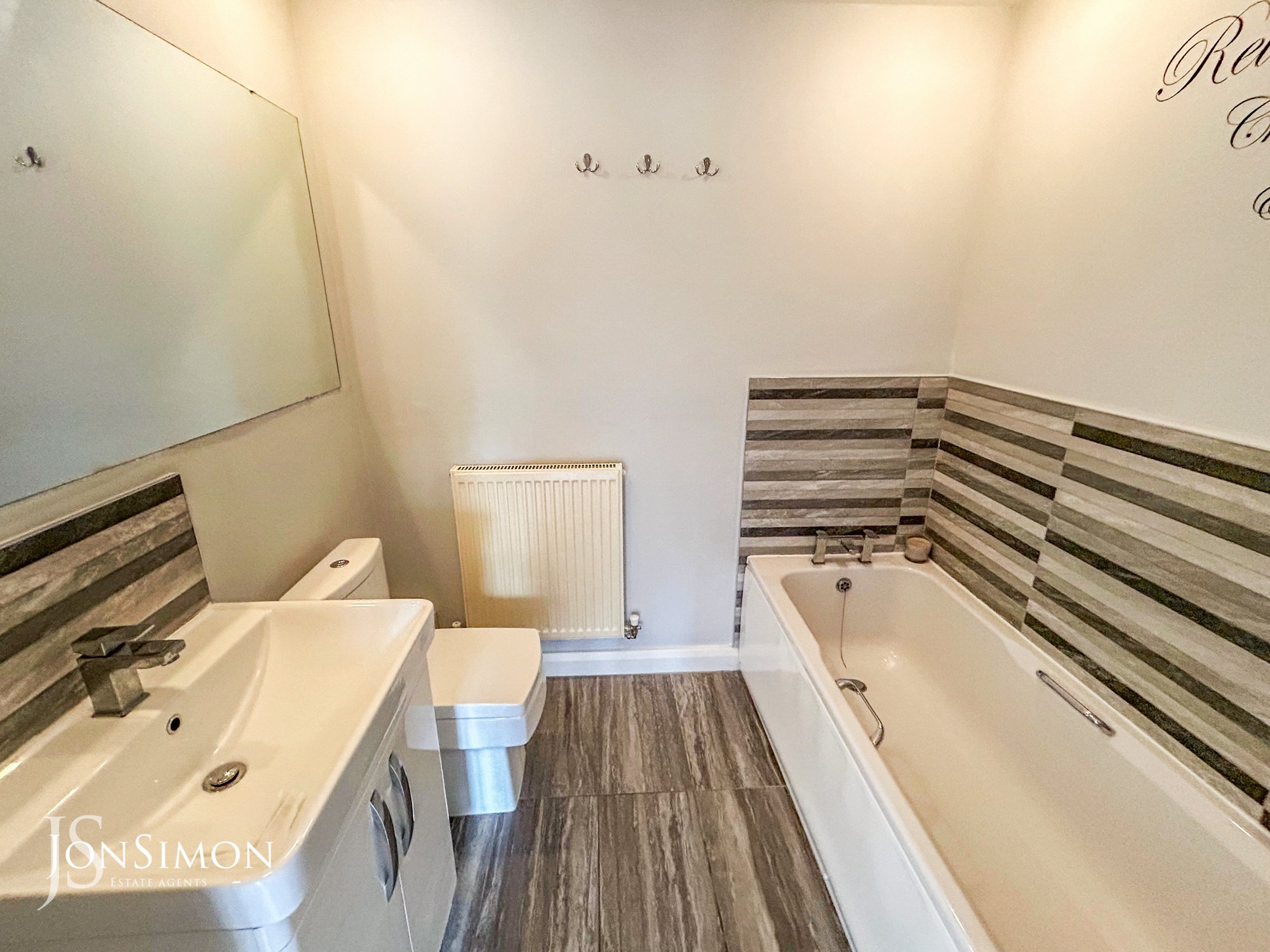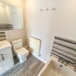 Modern three piece suite of bath, WC, wash hand basin, part wall tiles, large vanity mirror, four spotlights, extractor fan, wall mounted radiator.