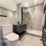 2.72m x 1.47m (8'11 x 4'10) - A three piece suite comprising of a double direct feed rainfall walk in shower, vanity top wash basin with mixer tap, dual flush WC, heated towel rail, granite effect tiled elevations, inset mirror and shelving, spotlights, extractor fan, granite effect tiled flooring.