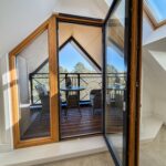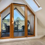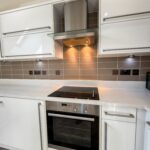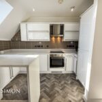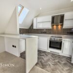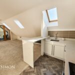 7.59m x 4.70m (24'11 x 15'5) - Three Velux windows, two UPVC double glazed windows, two central heating radiators, a range of high glossed wall and base units, marble effect surface, tiled splash backs, inset stainless steel sink with a high spout mixer tap, integrated electric oven with a four ring electric hob and extractor hood, integrated fridge freezer and dishwasher, plumbing for washing machine, under unit lighting, television point, breakfast bar, smoke alarm, Karndean Flooring, UPVC double glazed door to the balcony.