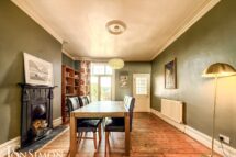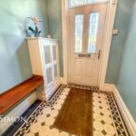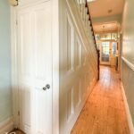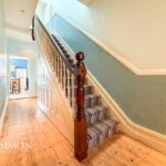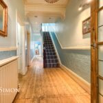Original wooden flooring, radiator, ceiling coving storage cupboard under the stairs, wall lights and stairs leading to the first floor landing