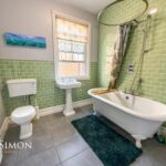 Three piece white suite comprising of a roll top freestanding bath with mixer taps, shower above, low level WC, wash hand basin, radiators, tiled flooring, parts tiled walls, ceiling point and side window.