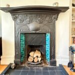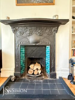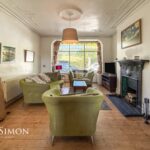 French patio doors, feature fireplace with open fire, ceiling coving, ceiling rose and ceiling point.