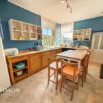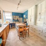 Range of wall and base units with complementary wooden work surfaces, two bowl sink unit with mixer tap, gas range cooker with five ring gas hob, plumbed for dishwasher, ceiling spotlights, double glazed side windows and rear window.