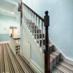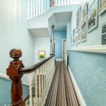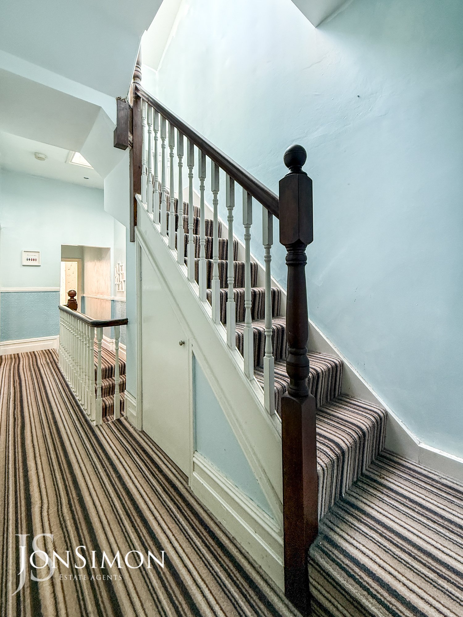 Ceiling window, radiator, storage under the stairs, ceiling spotlights, ceiling coving and stairs leading to the second floor landing.