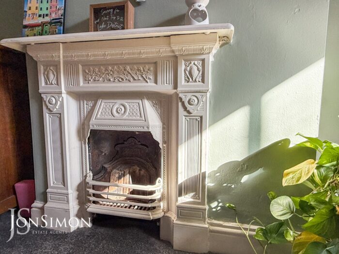 Double front glazed window, radiator, feature fireplace and ceiling point.