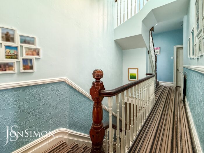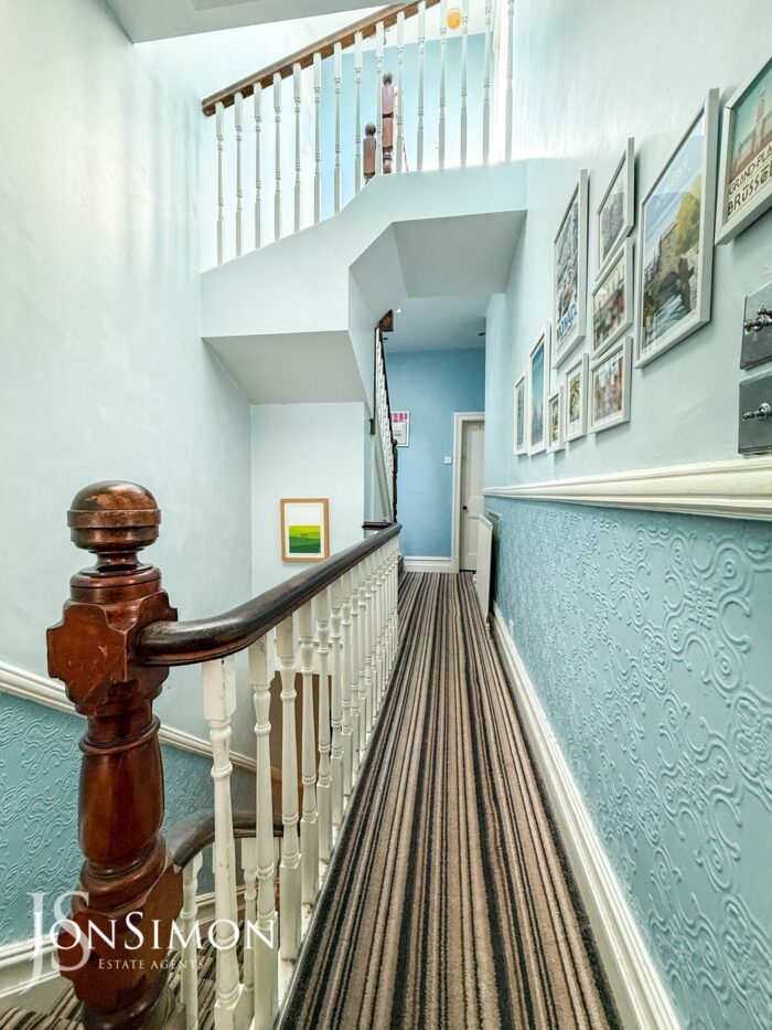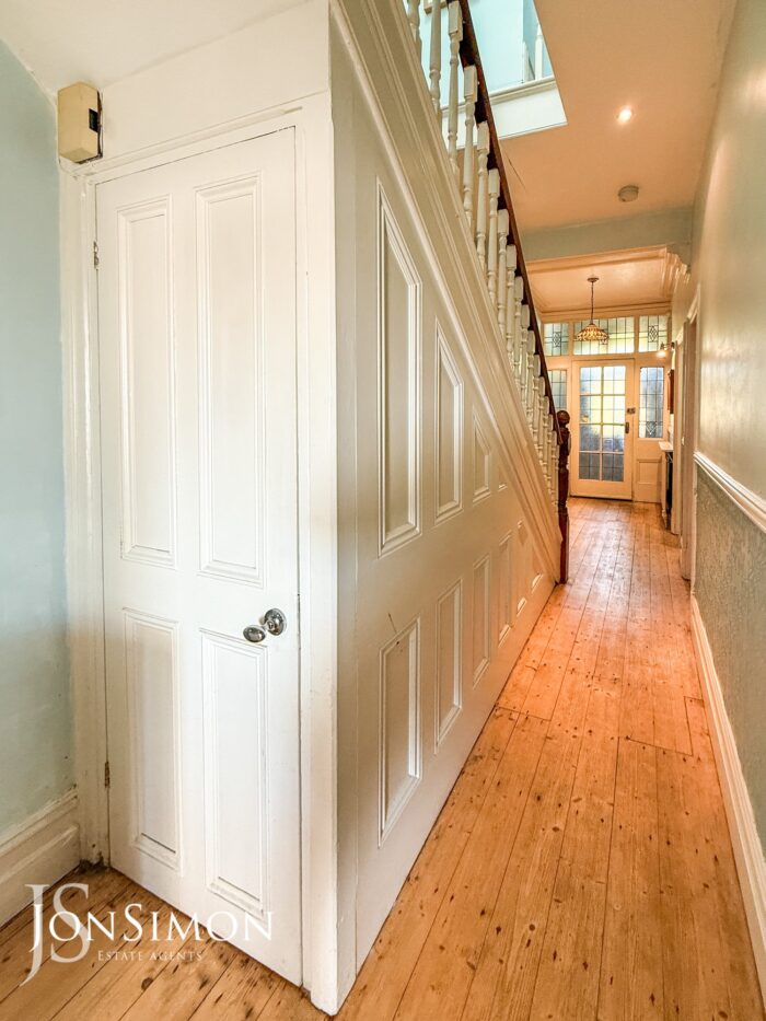Original wooden flooring, radiator, ceiling coving storage cupboard under the stairs, wall lights and stairs leading to the first floor landing