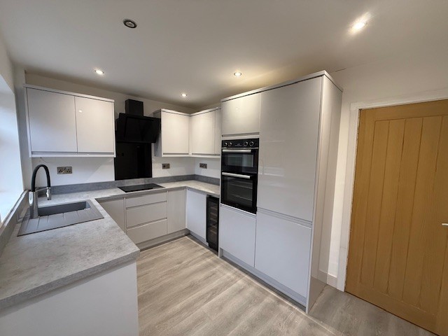 Leading off the living room, a fully fitted modern kitchen with integrated features such as oven/hob and wine cooler.