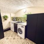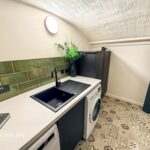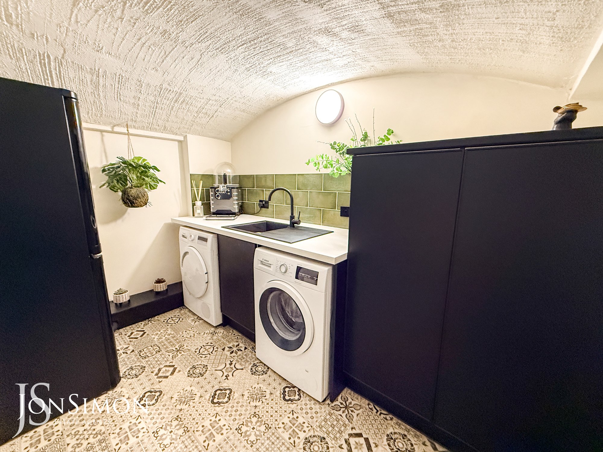 A modern range of base units with complimentary worksurface, single bowl sink unit with drainer, plumbed for washing machine and dryer, combi boiler, power point, wall light and tile effect flooring.