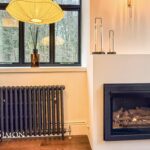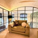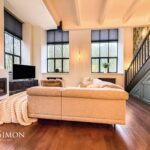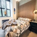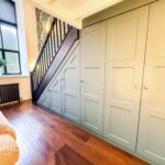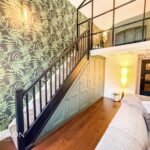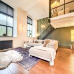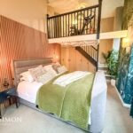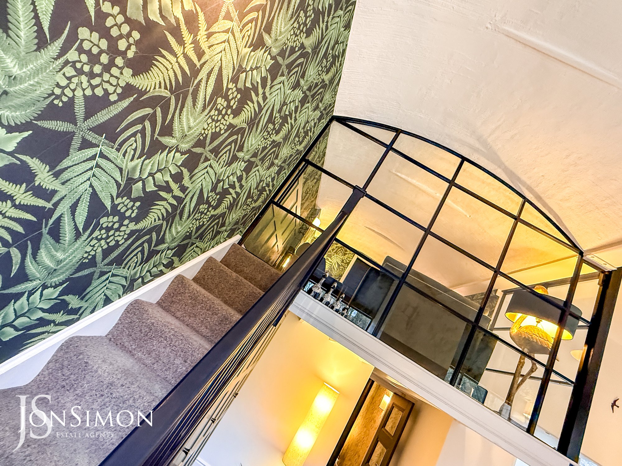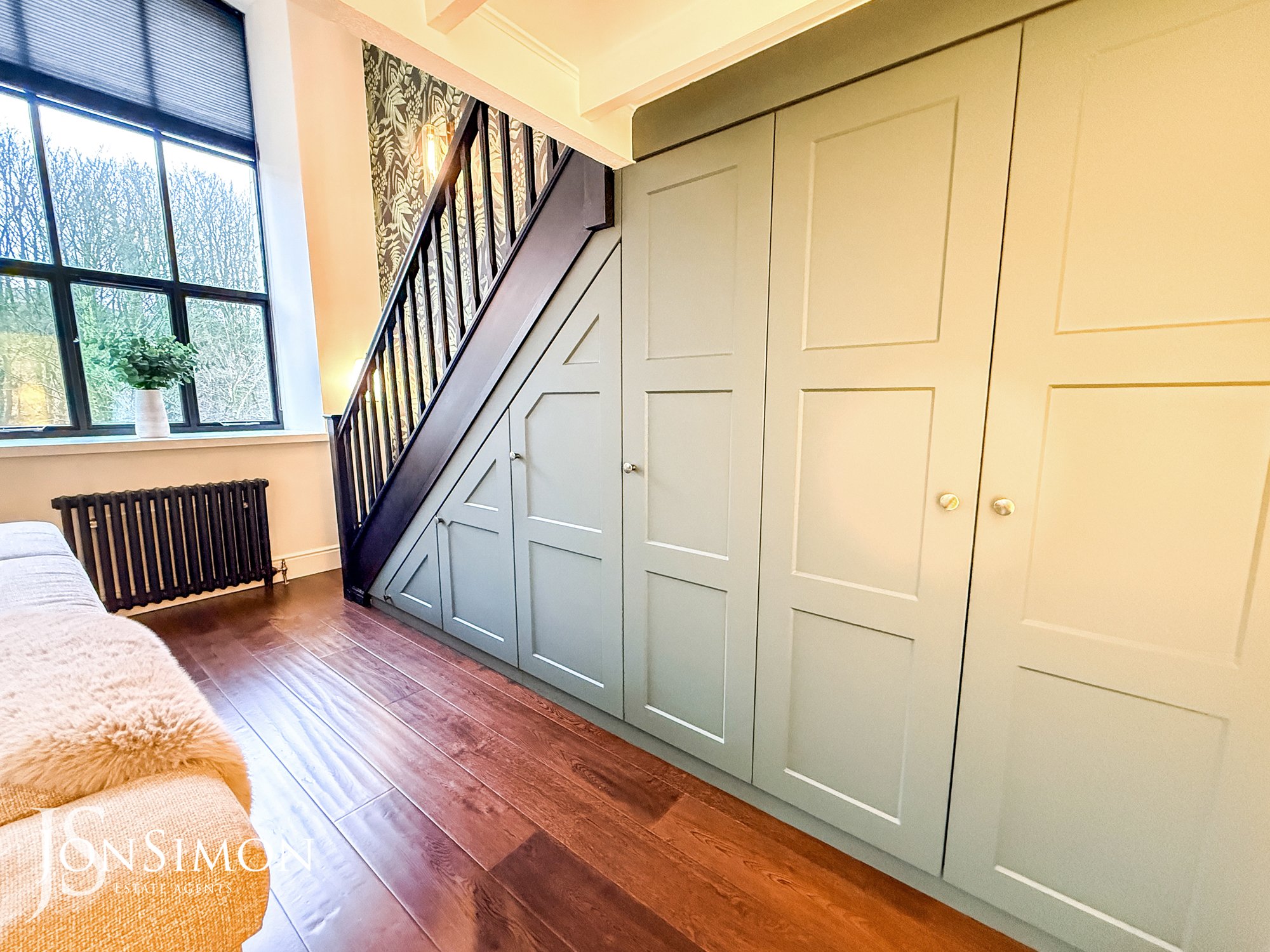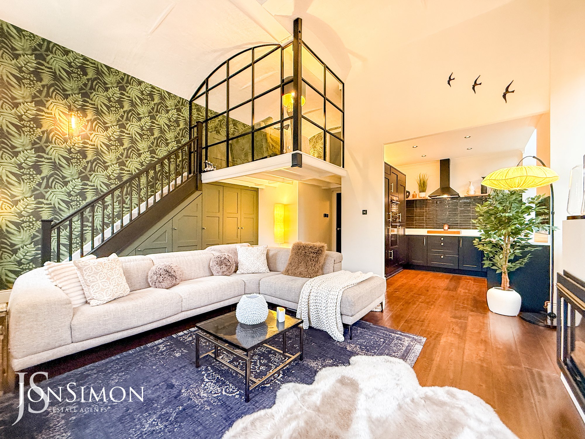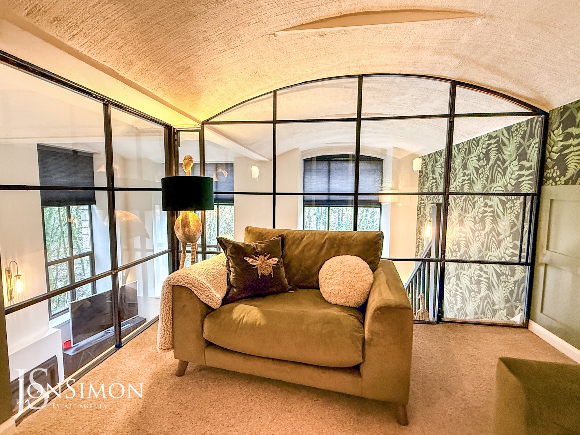 A light and airy room with barrel vaulted ceiling and large windows to two elevations. Staircase to mezzanine sitting room. Views to the South over the River Irwell. Modern flueless wall mounted gas fire, TV point, radiators, engineered wood effect flooring, wall lights, built in under stairs cupboards with power points, double glazed windows, stairs leading up to the sitting room.