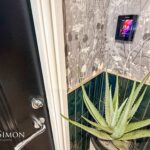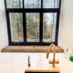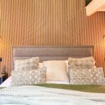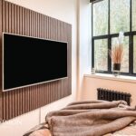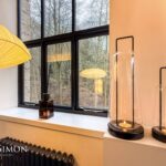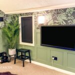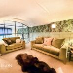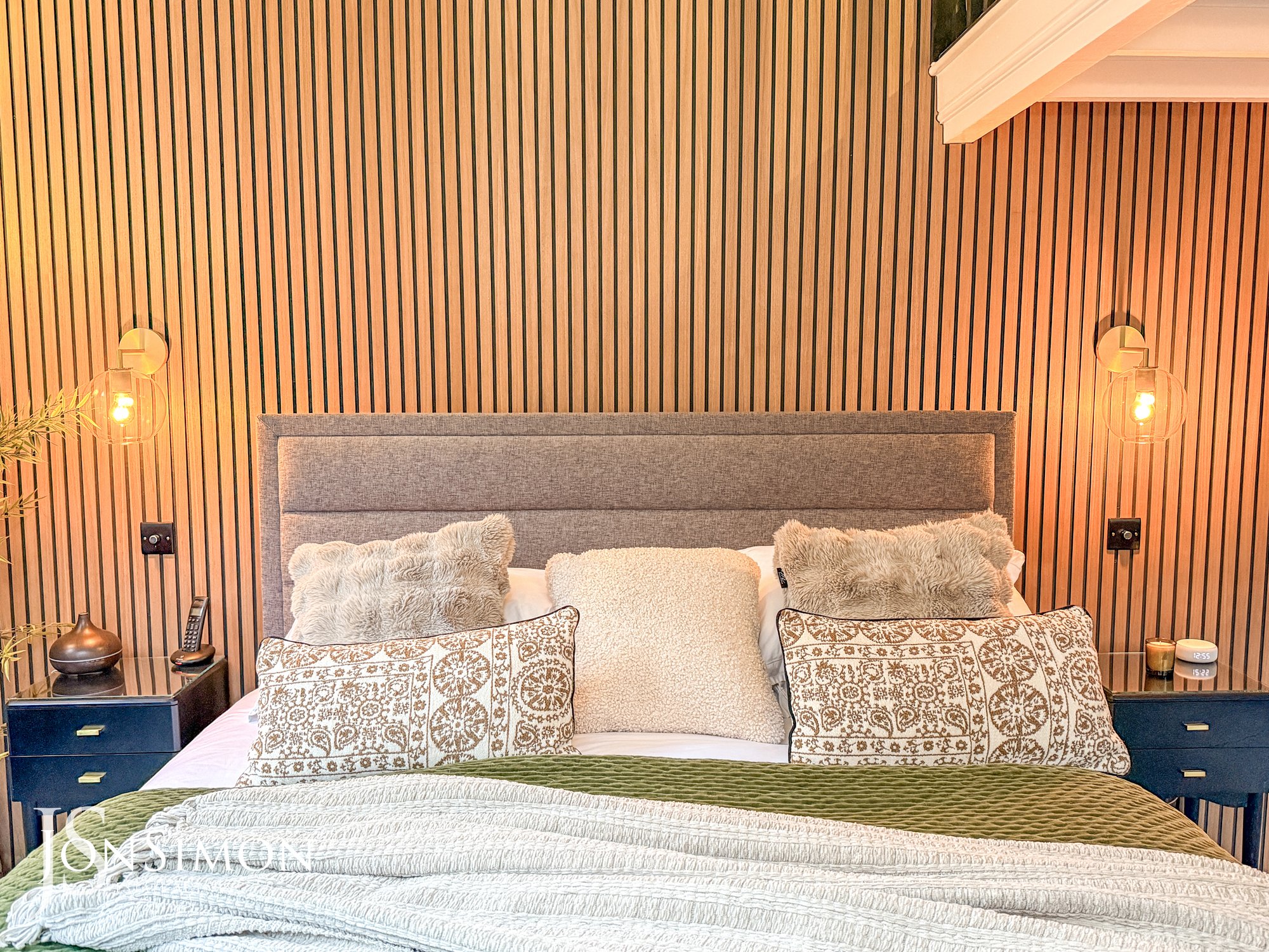 Black aluminium windows and door, TV point, wall lights, wood panelling walls.