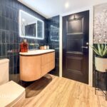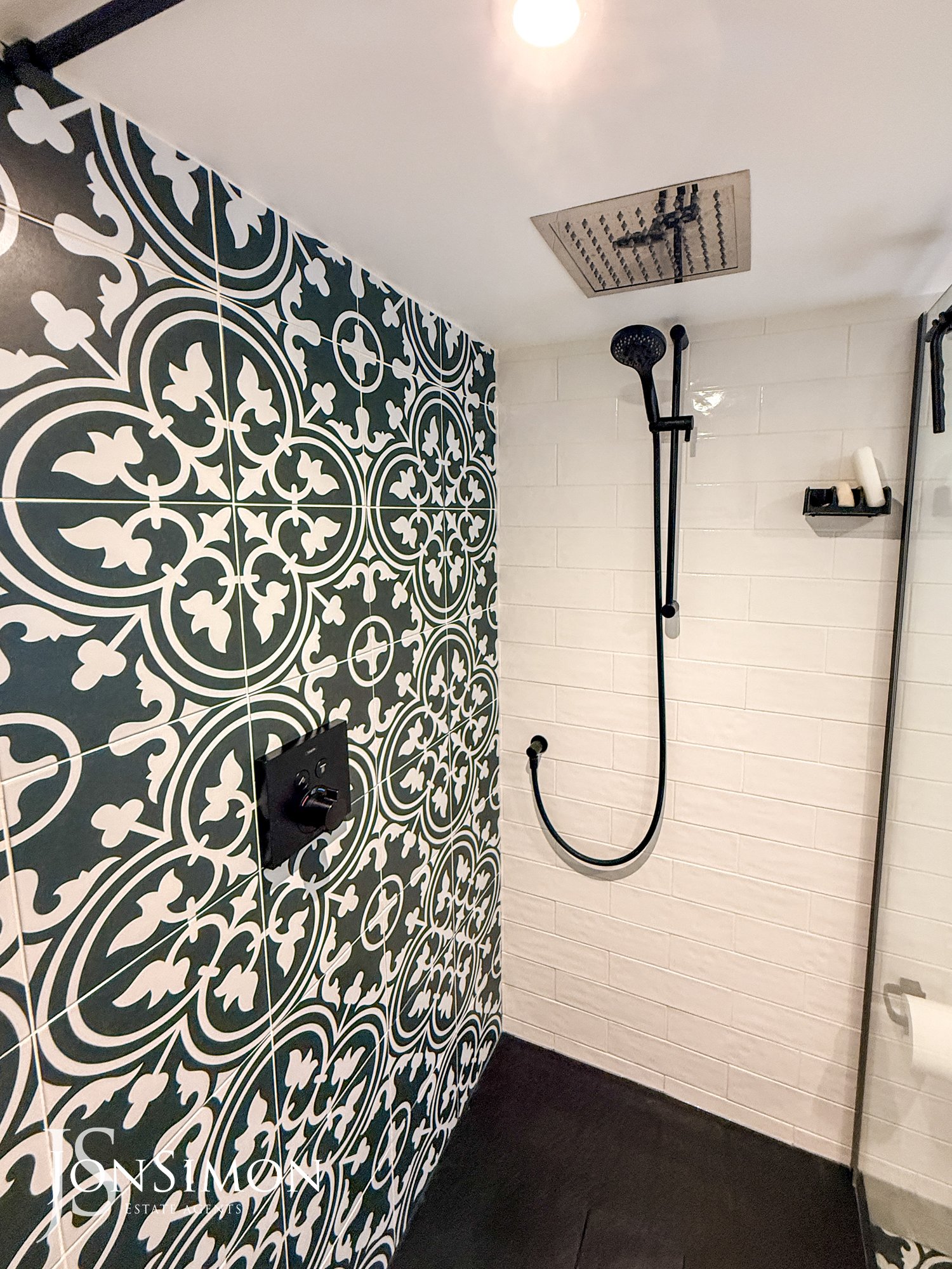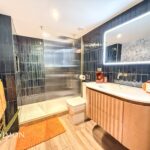 A contemporary three-piece white suite comprising of a large walking shower unit, low level WC, wash hand basin with storage drawers underneath, electric wall mounted mirror, extractor unit, towel radiator, part tiled walls, tiled flooring with electric underfloor heating, shaver point and ceiling spotlights.