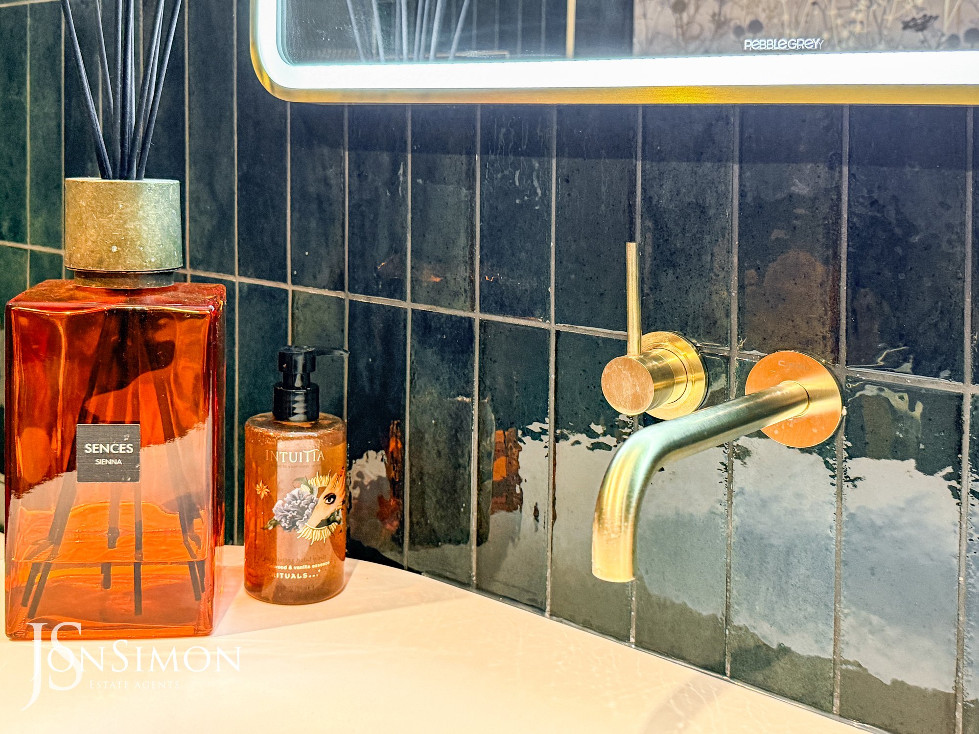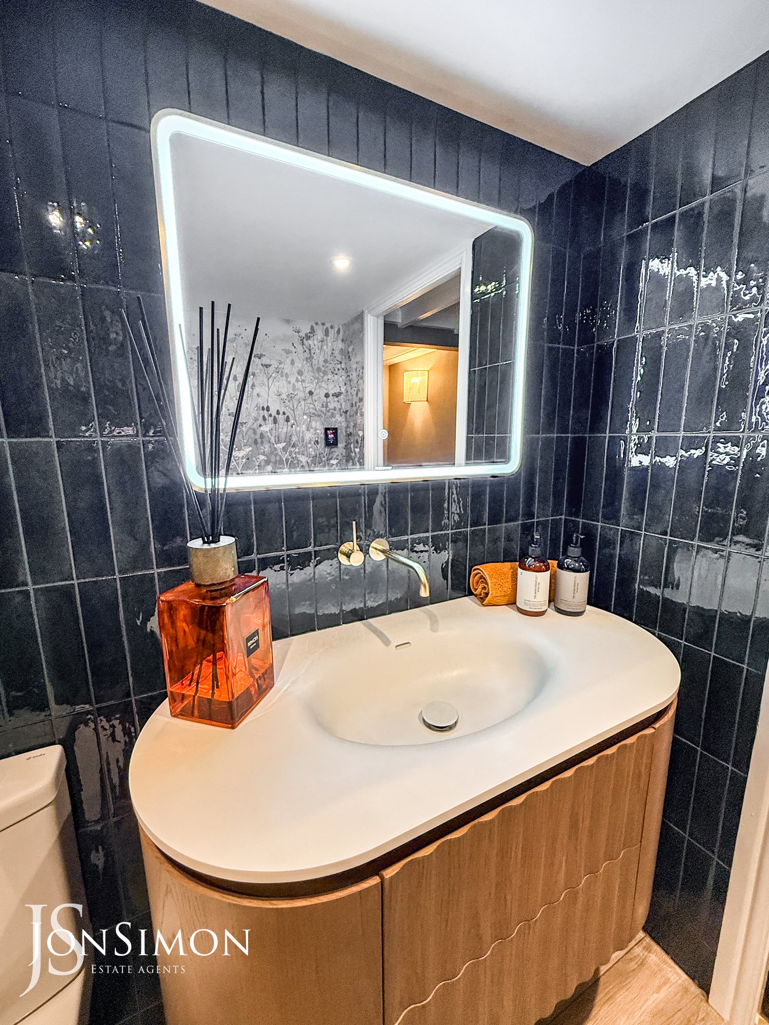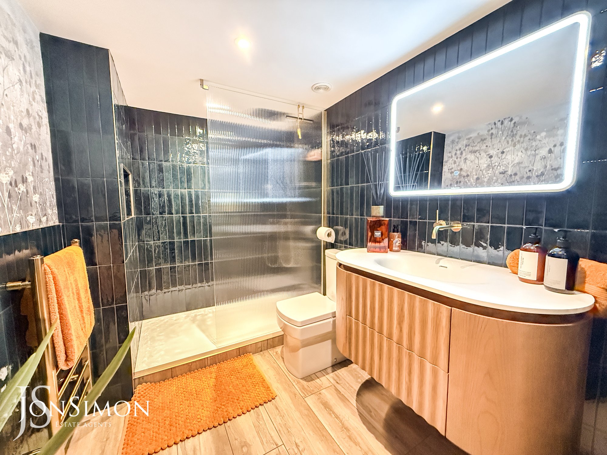 A stunning three-piece white suite comprising of a large walking shower unit, low level WC, wash hand basin, electric wall mounted mirror, radiator, fully tiled walls and flooring with electric under the floor heating, extractor unit and ceiling spotlights.