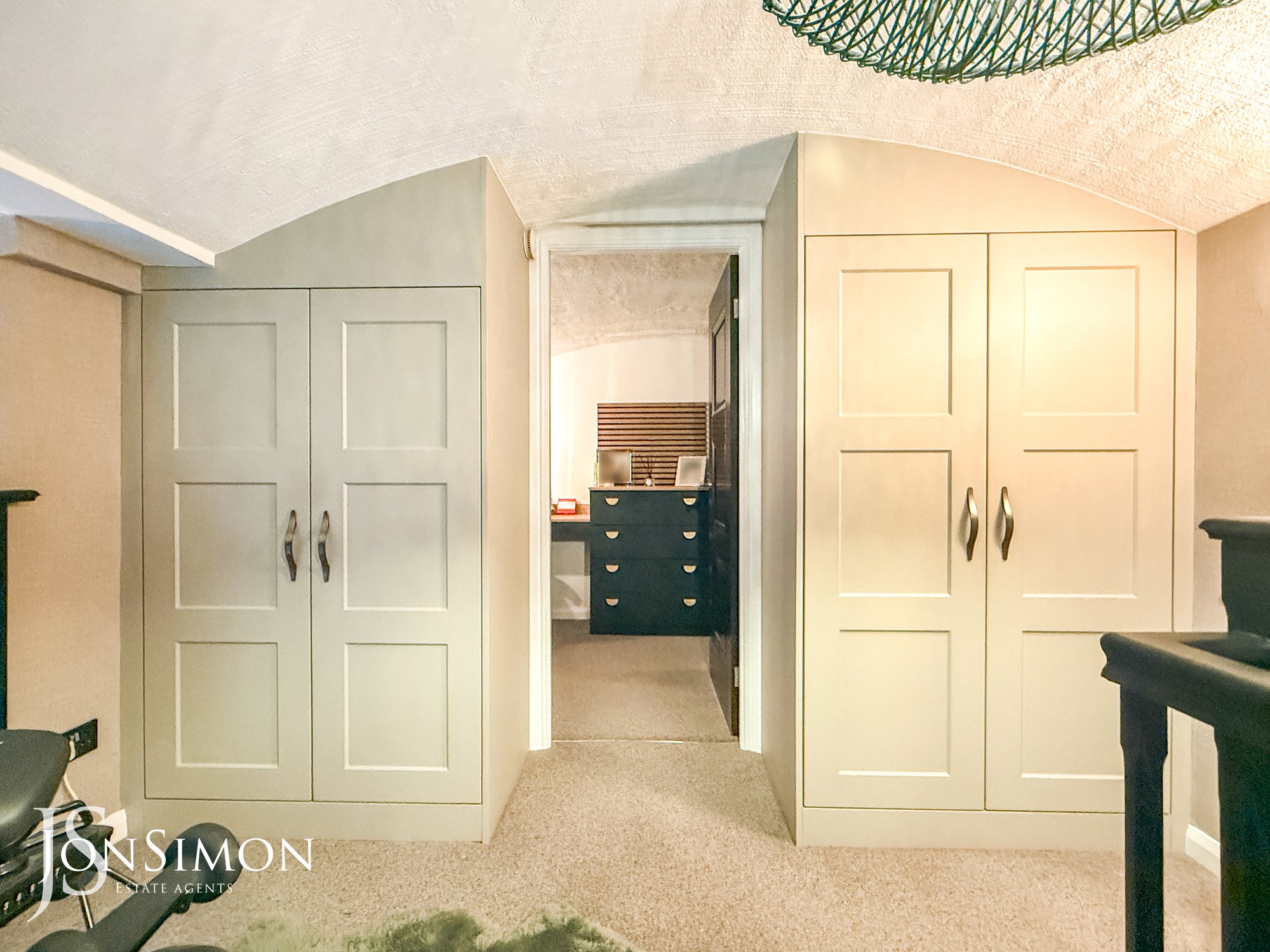 Three double glazed windows, radiators, feature wall lights, built-in wardrobes and stairs leading up to the mezzanine level.