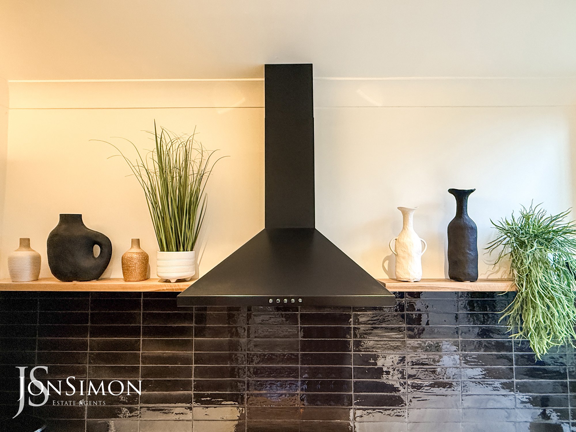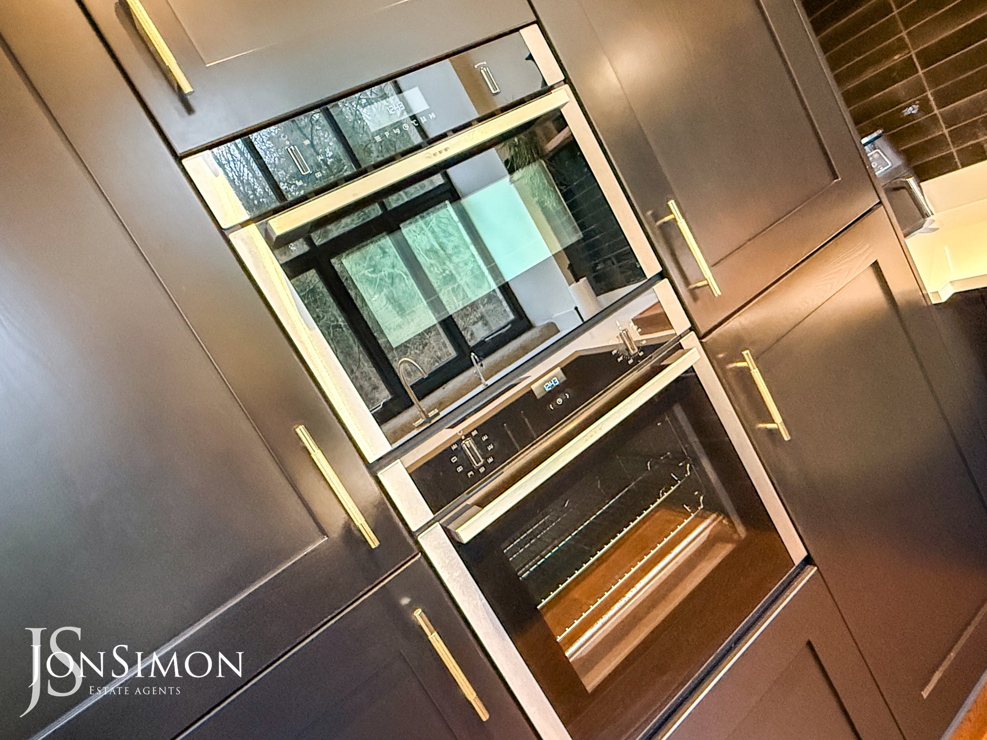 A contemporary fully fitted kitchen with a range of wall and base units with complementary worksurface, four ring gas hob with extractor unit above, integrated fridge, freezer, combi microwave and electric oven, single bowl sink unit with drainer with hot water tap again, engineered wood effect flooring, parts tiled walls, ceiling coving, ceiling spotlights and double glazed windows.