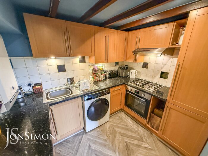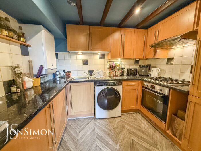 2.68m x 1.99m (8' 10" x 6' 6") A fully fitted adjoining kitchen with an ample range of shaker style wall and base cabinets with contrasting work surfaces and ceramic splash back tiling, wall mounted Baxi central heating boiler, plumbing in place for automatic washing machine, fan assisted stainless steel oven with matching hob and over head extractor canopy, integral fridge and freezer, ceiling down spotlighting, ample power points, vinyl flooring and stainless steel sink and drainer with chrome mixer taps.
