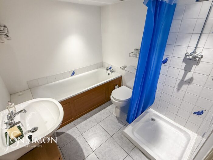 2.23m x 1.95m (7' 4" x 6' 5") A four piece modern bathroom comprising of low level wc with button flush, pedestal hand wash basin with chrome mixer taps, shower enclosure with integrated chrome shower, panelled bath with chrome taps, ceramic wall tiling, ceiling extractor and ceiling down spotlighting.
