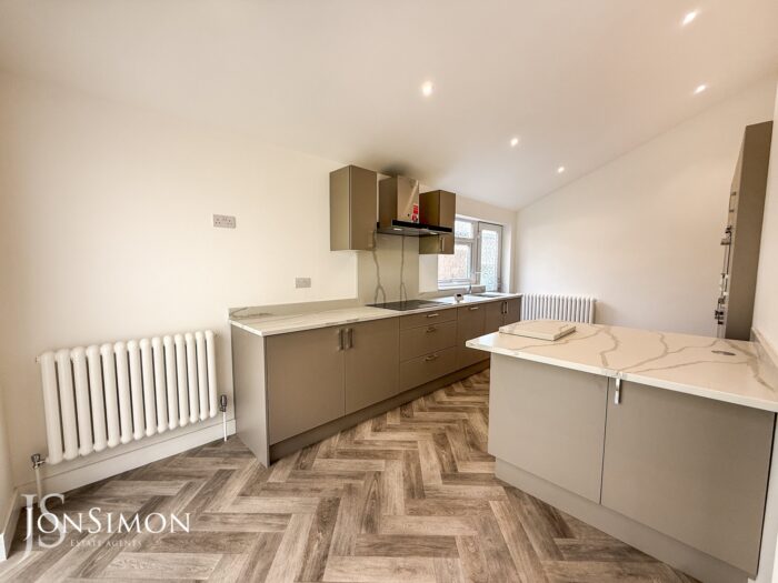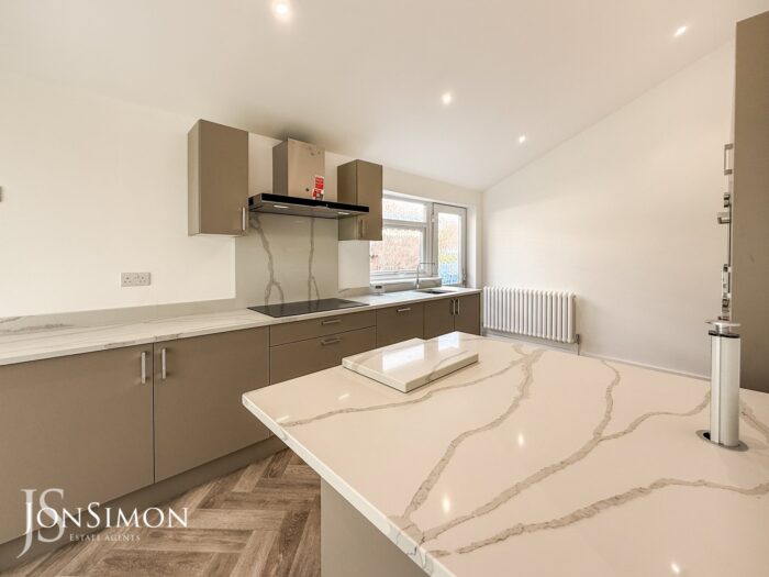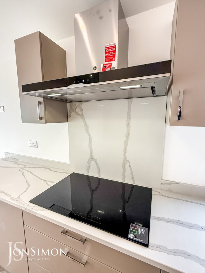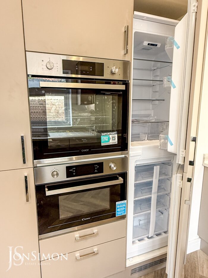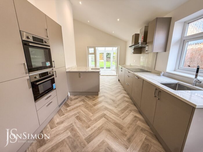 A brand-new contemporary fitted kitchen with a range of wall and base units with complementary work surfaces, single bowl sink unit with drainer, four ring electric hob with extractor unit above, integrated fridge, freezer, dishwasher, microwave and electric oven, pop-up worksurface power point, radiators, breakfast bar, ceiling spotlights, UPVC double side window and UPVC double glazed side door.