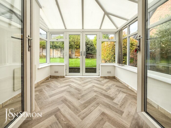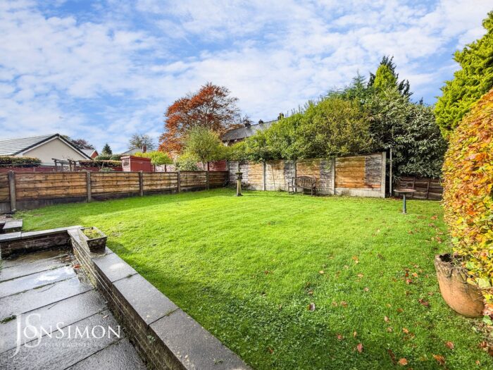 Rear: A flagged patio area, well established lawn with well established borders and shrubs. Fence panels surround with gated access to the side.