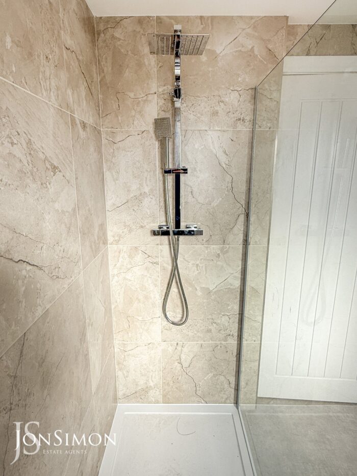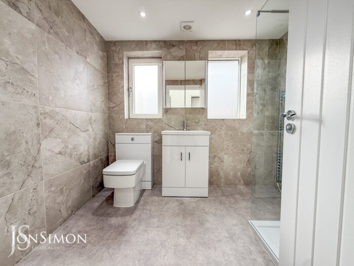 A brand new modern three-piece white suite comprising of a large walk-in shower unit, low-level WC, wash hand basin with storage cupboard underneath, chrome radiator, wall mounted mirror, fully tiled walls, extractor unit, ceiling spotlights and two UPVC double glazed side windows.