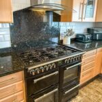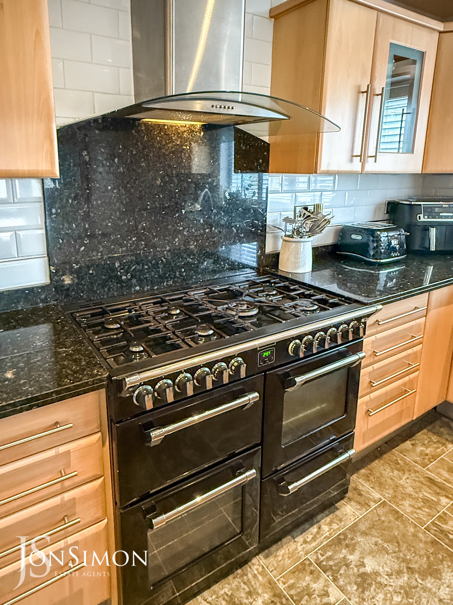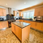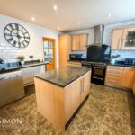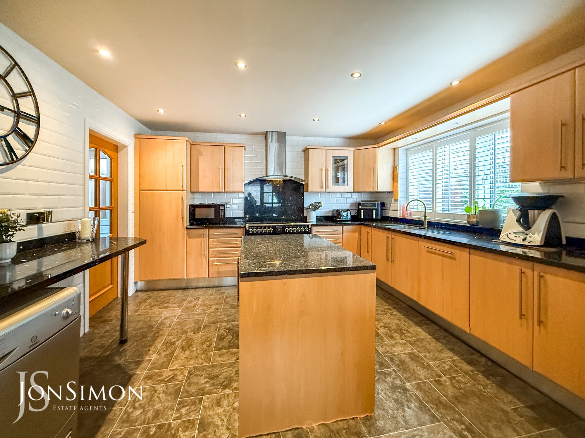 UPVC double glazed window with fitted shutters, central heating radiator, range of contemporary wall and base units with granite surfaces, island with coordinating units and worktop, breakfast bar, Stoves range cooker with seven ring gas hob, extractor hood, integrated dishwasher, enclosed boiler, grey slate Karndean flooring and double doors to reception room two.