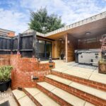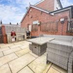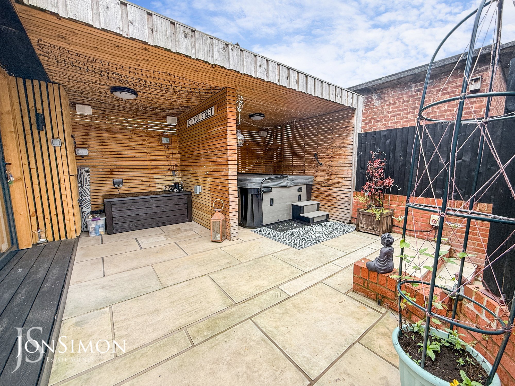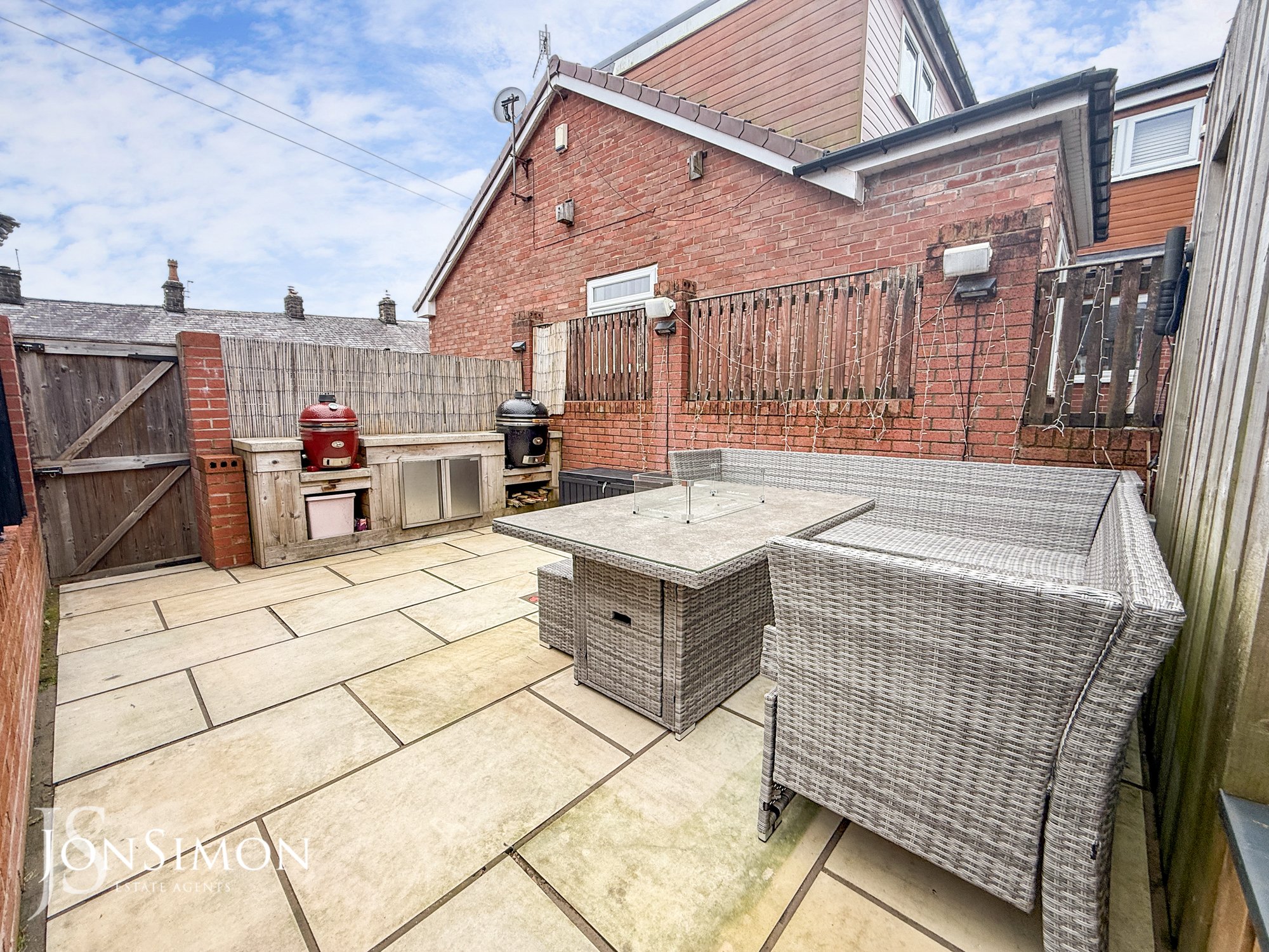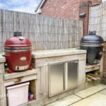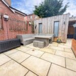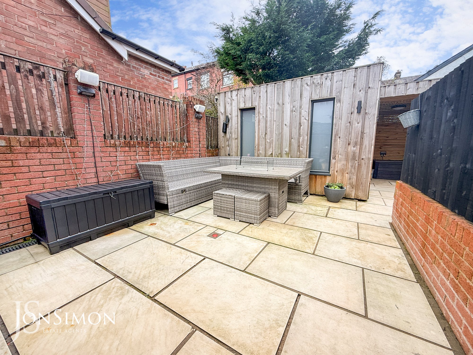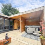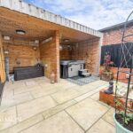 Rear - Indian stone paved patio with seating and BBQ area, bespoke outdoor entertainment area ideal for a hot tub area, bar and a studio.