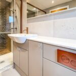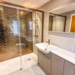A contemporary three-piece white suite with a large walk-in shower unit, low level WC, wash hand basin, storage cupboards, towel radiator, wall mounted mirror, fully tiled walls and flooring, underfloor electric heating, ceiling spotlights, extraction unit and UPVC double glazed side window