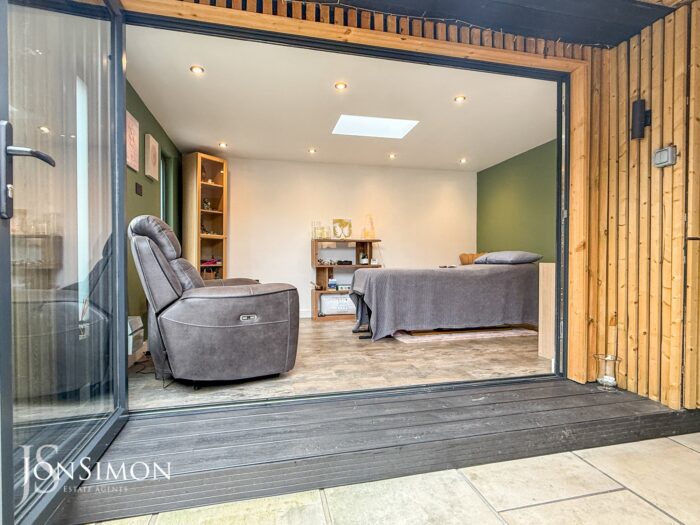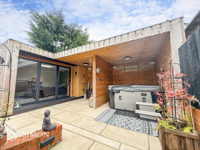 Rear - Indian stone paved patio with seating and BBQ area, bespoke outdoor entertainment area ideal for a hot tub area, bar and a studio.