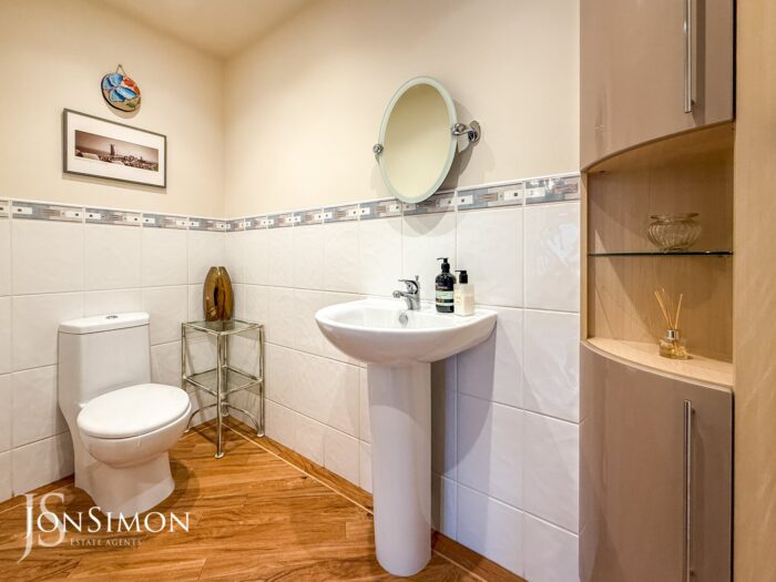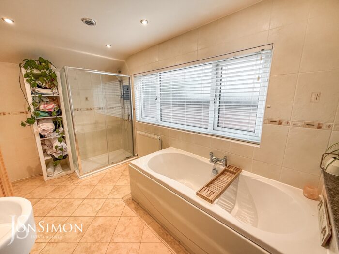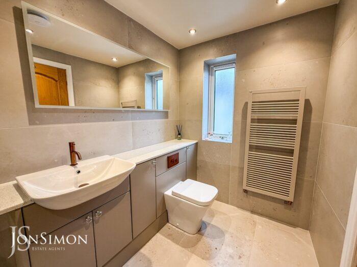 UPVC double glazed frosted rear window, central heating radiator, low basin WC, vanity top wash basin, double panelled bath, electric feed shower unit, tiled elevations and Karndean flooring.