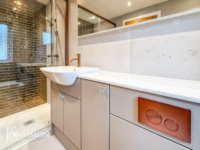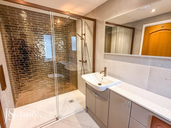 A contemporary three-piece white suite with a large walk-in shower unit, low level WC, wash hand basin, storage cupboards, towel radiator, wall mounted mirror, fully tiled walls and flooring, underfloor electric heating, ceiling spotlights, extraction unit and UPVC double glazed side window