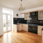 A modern range of wall and base units with complimentary worksurface, single bowl sink unit with drainer, gas cooker with five ring gas hob, extractor hood above, part tiled walls, solid oak flooring, radiator, plumbing for washing machine, ceiling point, UPVC double glazed French patio doors.