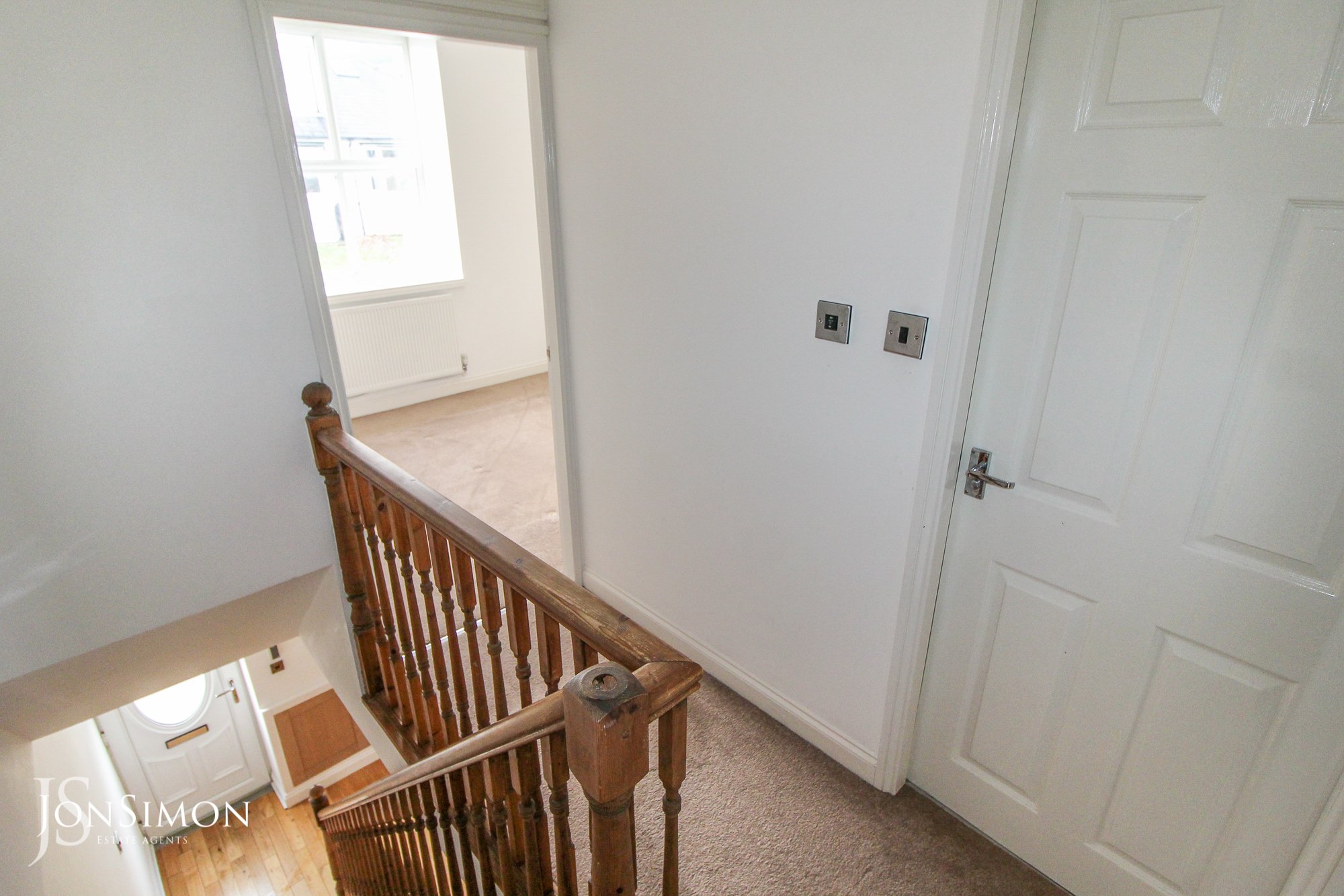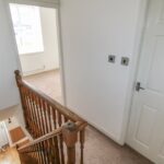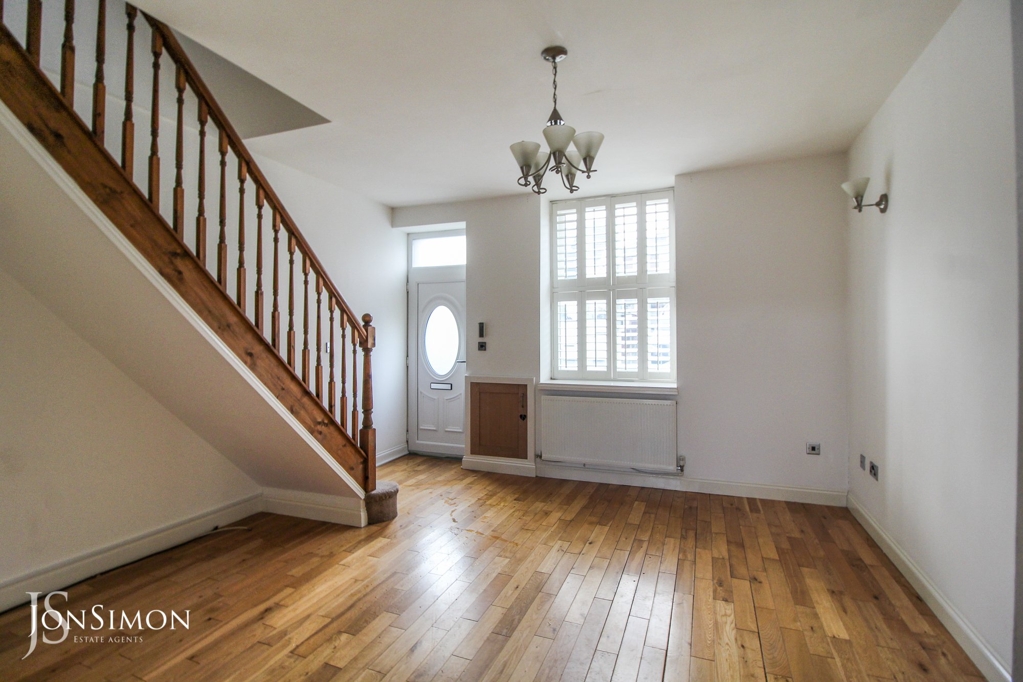 UPVC double glazed front door and window, radiator, meter cupboard, solid oak flooring, TV point, wall lights, ceiling point and stairs leading to the first floor landing.
