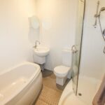 A modern four piece white bathroom suite, comprising of a panelled bath with mixer tap, walk-in shower unit, low-level WC, wash hand basin, towel radiator, tiled walls and ceiling point.