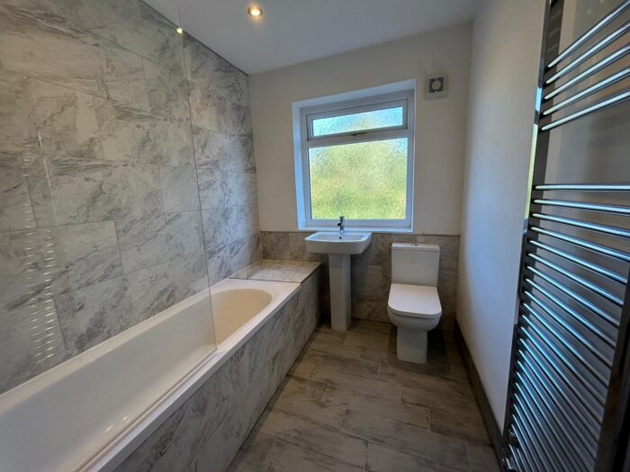 A modern three-piece white bathroom suite comprising of a towel bath with shower, head above, glass, shower, screen, chrome radiator, part-timers walls, timer flooring, extractor unit, Siri, spotlights and UPVC double glazed rear window.