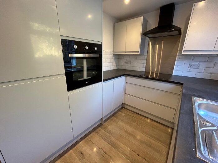 A modern city kitchen, arrange wall and base units were complimentary worksurface, I think about the sink unit with trainer, Electric oven, four and electric hob with extractor unit above, integrated fridge, and freezer, Combi, boiler, plumbing for washing machine, Patetown, walls, radiator, laminate flooring, UPVC double glaze rear window and composite double glaze rear door.