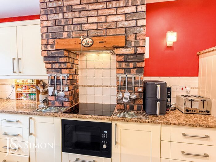 Modern range of wall and base units with complimentary granite works surfaces, four ring ceramic hob with extractor unit above, integrated double electric oven, microwave and dishwasher, 1 1/2 bowl sink unit with drainer, part tiled walls, tiled flooring, extractor unit, radiator, ceiling spotlights, UPVC double glazed rear window and UPVC double glazed French patio doors.