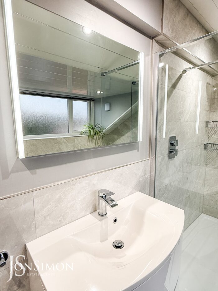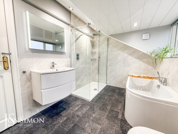 A modern four piece white suite comprising of a large walk -in shower unit, panel bath with mixer tap and shower head, low-level WC, wash hand basin with storage drawers underneath, wall mounted mirror, part tiled walls, extractor unit, towel radiator, ceiling spotlights and UPVC double glazed front window.