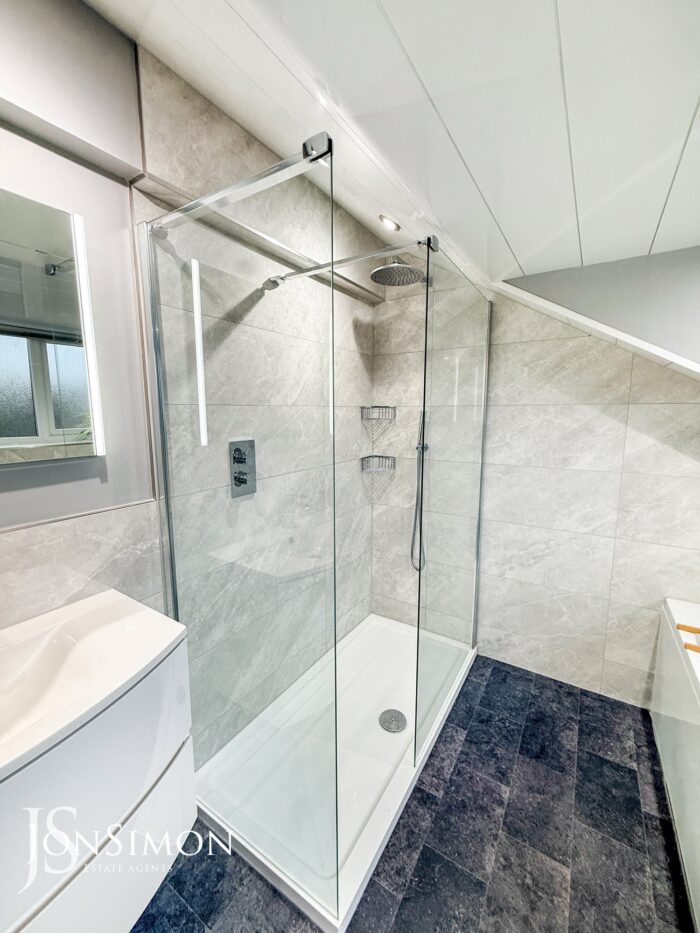 A modern three-piece white suite comprising of a walk-in shower unit, low level WC, wash hand basin with storage cupboards underneath, solid wood flooring, radiator, extractor unit and ceiling point. UPVC double glazed rear window.