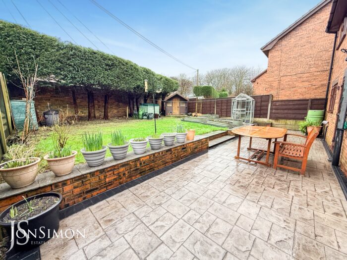 Rear: A large concrete pattern pressed patio area, lawn area, well established borders and shrubs, vegetable patches, wooden summer house, outside water tap, gated access to the side and fence panel surround.
