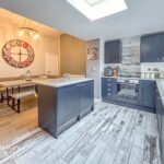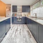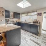 A contemporary fitted kitchen with range of wall and base units, appliances include gas hob, oven and extractor, fridge, freezer and washing machine, white oak style tiled flooring and elevations, UPVC double glazed window to the rear.