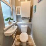 A two piece white suite comprising of a low level w/c, wash hand basin, tiled flooring, combi boiler and UPVC double glazed side window.