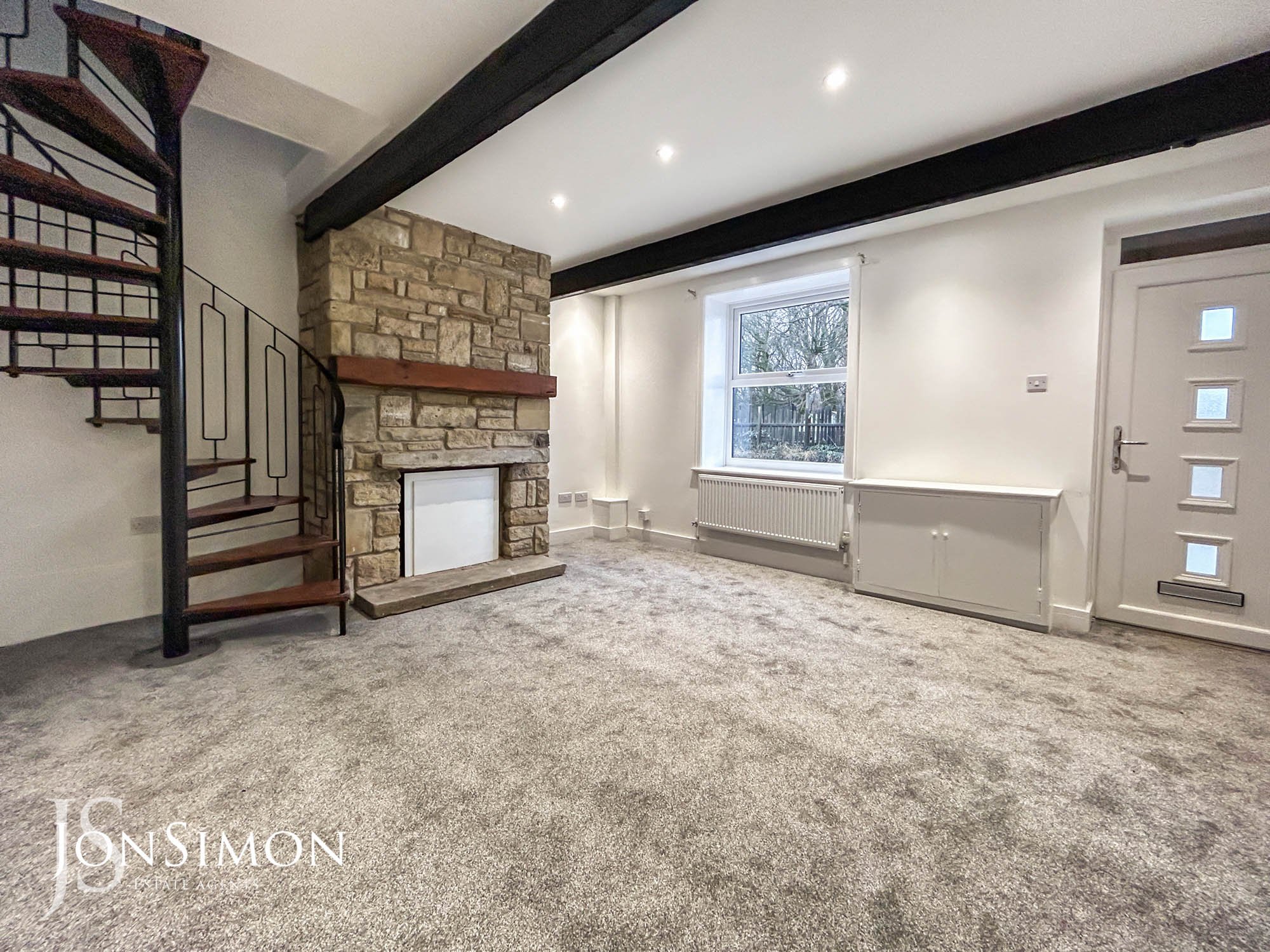 15' 1" x 14' 3" (4.61m x 4.34m) UPVC double glazed front door and window, radiator, gas fire with exposed stone chimney breast, TV point, laminate flooring, ceiling beams and spiral staircase.