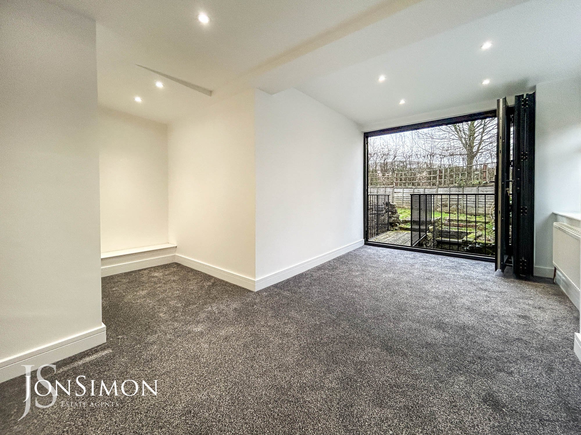 A space where the bedroom will go, radiator, double glazed sid, and rear windows, back door with bridge leading to garden.